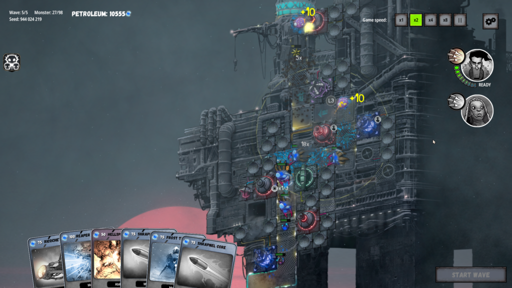 Tower Petroleum blends tactical tower defense with deckbuilding strategy in a harsh, ice-covered future where humanity survives on abandoned oil extraction towers. Players construct and upgrade defenses, assemble card-based builds, select unique heroes, and face escalating waves of enemies – all while navigating moral decisions that influence their journey.